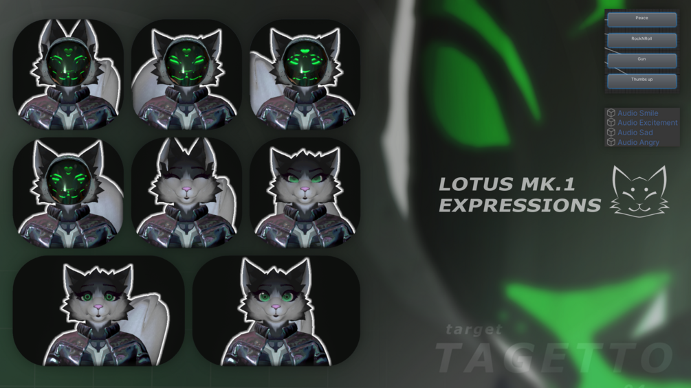 - Face Tracking - LOTUS MK1 uses Unified Expressions. It is compatible with Pawlygon FBT & Jerry's FBT Template.